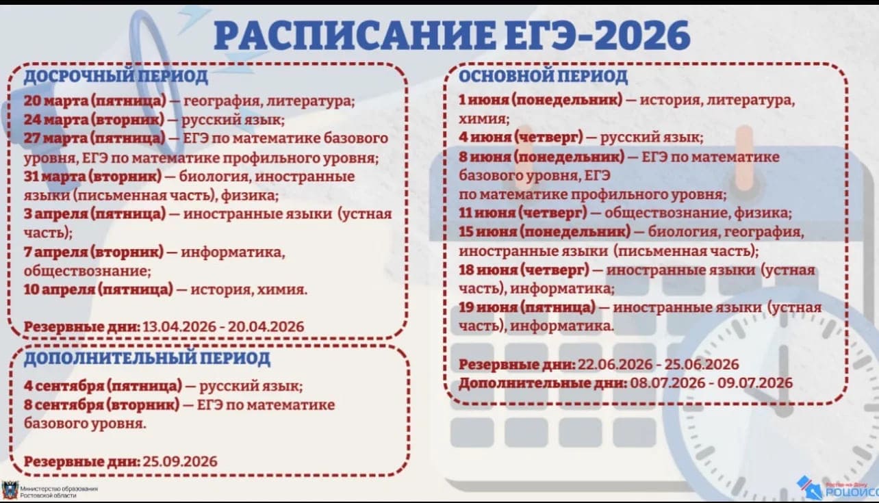 Минпросвещения России и Рособрнадзор утвердили даты проведения ЕГЭ и ОГЭ в 2026 году. Совместные приказы были опубликованы на Федеральном портале проектов нормативных правовых актов. ЕГЭ в 2026 году в досрочный период пройдет с 20 марта по 20 апреля, в основной период – с 1 июня по 9 июля, в дополнительный период – с 4 по 25 сентября.