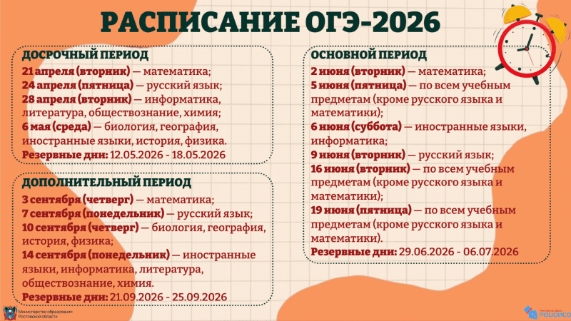 Досрочный период ОГЭ пройдет с 21 апреля по 18 мая, основной период – с 2 июня по 6 июля, дополнительный период – с 3 по 25 сентября. В каждом периоде предусмотрены резервные дни. Экзамены в форме ГВЭ проводятся в те же даты, что и ОГЭ.