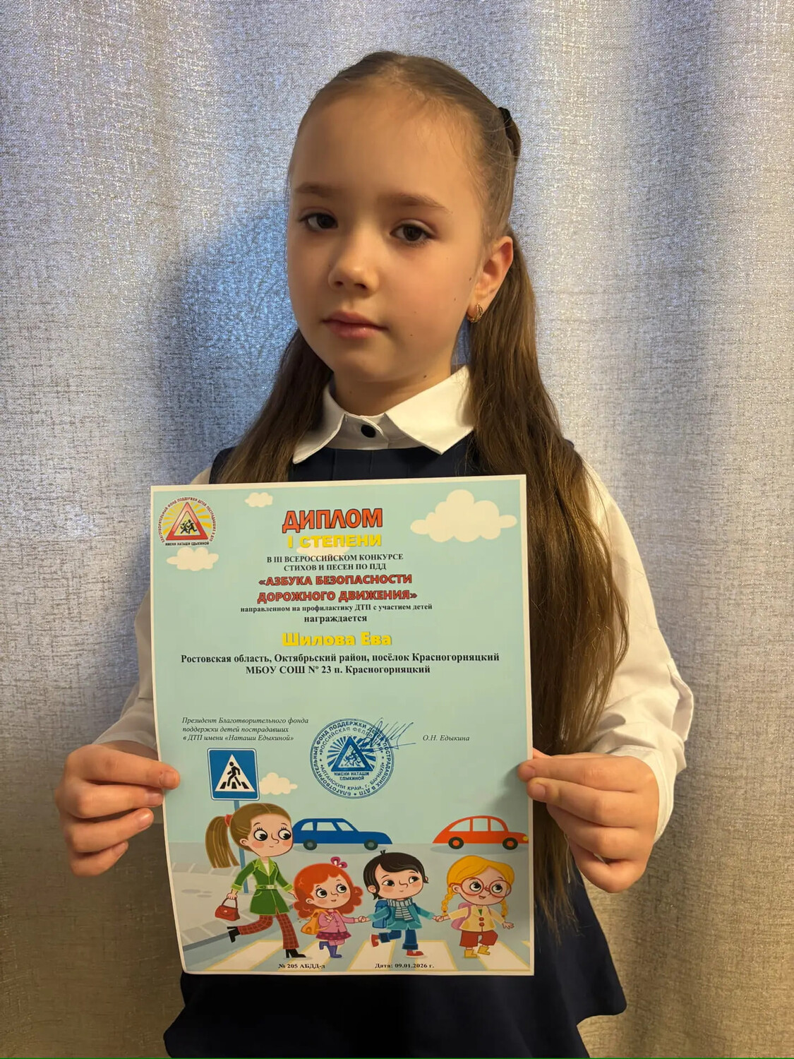 Ученица 1А класса МБОУ СОШ 23 Шилова Ева в рамках кружка " Дорожная азбука" приняла участие во Всероссийском конкурсе " Азбука безопасности дорожного движения" и была награждена дипломом 1 степени. Конкурс направлен на профилактику ДТП с участием детей. Поздравляем! |