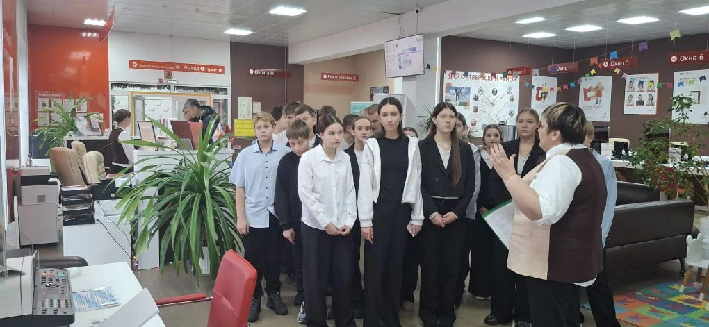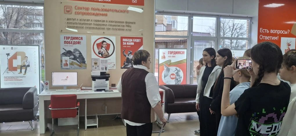 В рамках профориентационной работы 11 декабря 2025 года ученики 7 «А» класса посетили многофункциональный центр предоставления государственных услуг (МФЦ) п.Каменоломни. Ведущий специалист отдела приема- выдачи документов Гукова Л. провела экскурсию по зданию МФЦ, рассказала школьникам о специфике работы организации, об основных направлениях деятельности: получение справок, паспорта, адресной социальной помощи, жилищно-коммунальных субсидий, оформление прописки, права на земельный участок или регистрация приобретения и продажи квартиры - все это можно будет сделать в одном окне в МФЦ. Для удобства посетителей в зале есть ПК с возможностью выхода на портал Госуслуг.