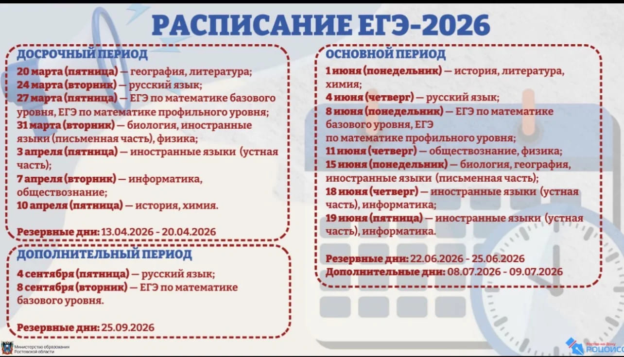 Совместными приказами Минпросвещения России и Рособрнадзора утверждены сроки проведения основного государственного экзамена (ОГЭ) и государственного выпускного экзамена (ГВЭ) в 2026 году, продолжительность экзаменов по всем учебным предметам, а также перечень дополнительных материалов, которые могут использовать участники на соответствующем экзамене.