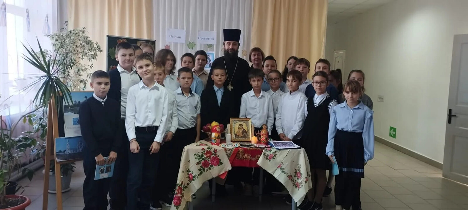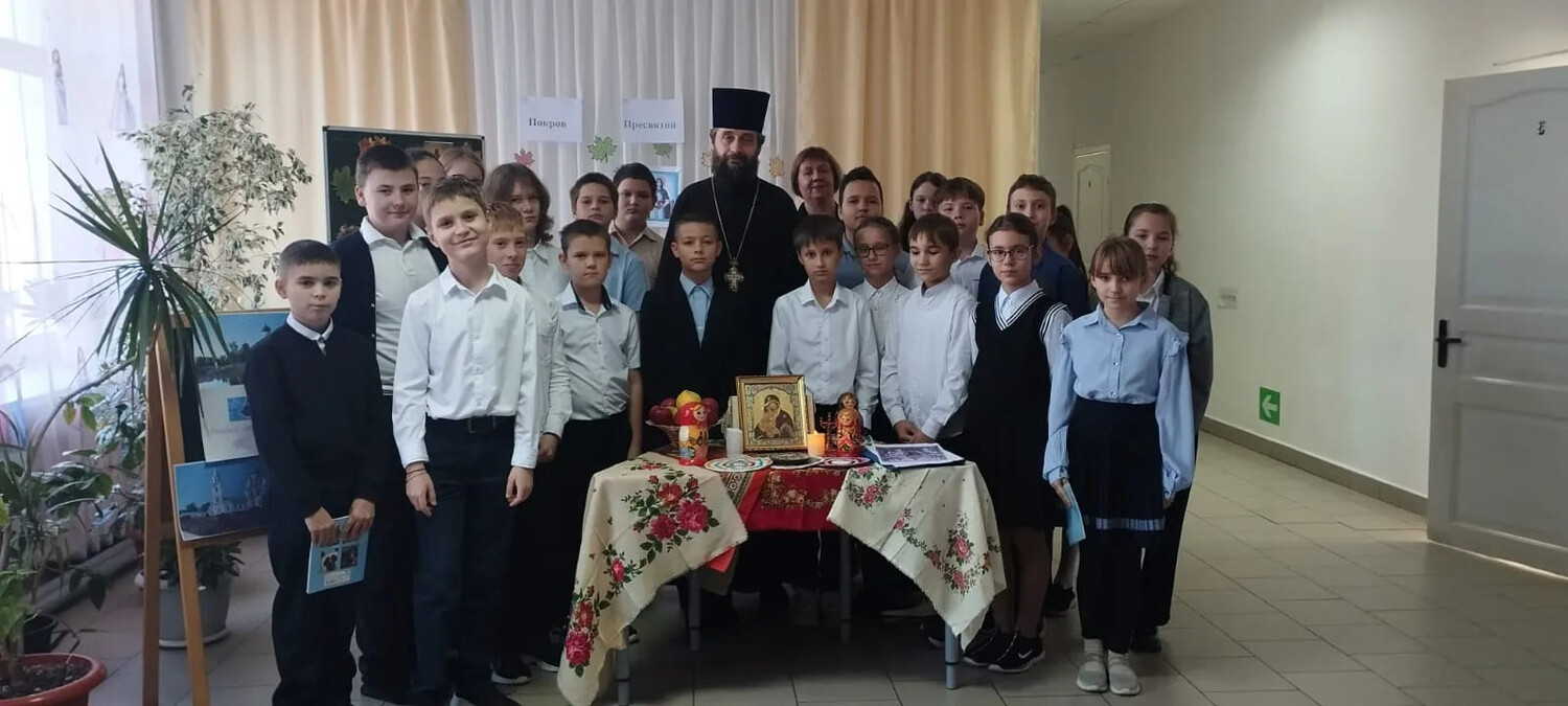 15 октября в ММБОУ СОШ №23 п. Красногорняцкий Октябрьского района был проведен тематический час «Покров Пресвятой Богородицы». В мероприятии принял участие благочинный приходов Нижнедонского округа протоиерей Сергий Яценко.