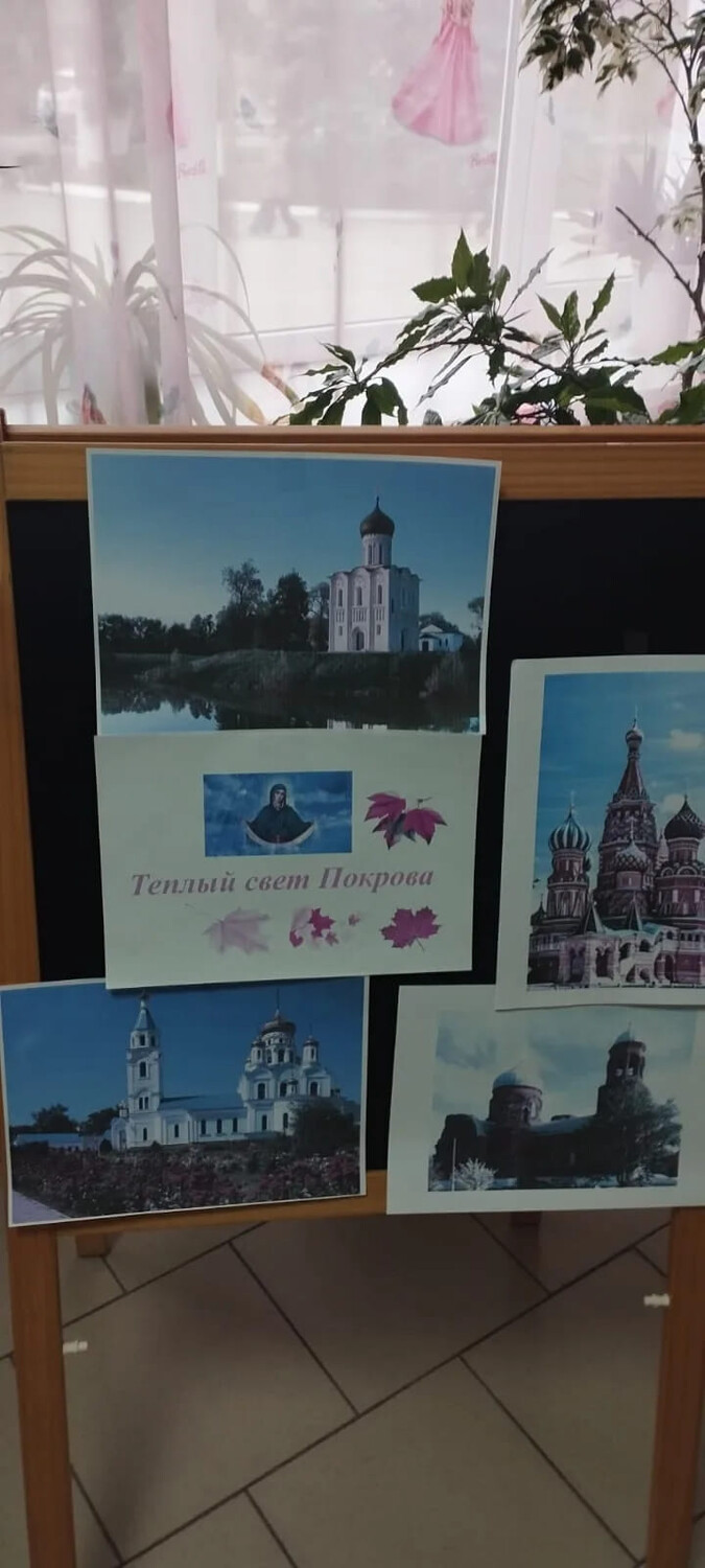 Учитель ОДНКНР Козина Н,В, рассказала о том, что праздник Покрова Пресвятой Богородицы, отмеченный светлым и радостным настроением, занял особое место в сердцах русского народа. В его честь создавались иконы, возводились храмы. Интересной для ребят стала небольшая выставка о храмах нашей Родины , построенных в честь Покрова Пресвятой Богородицы. Под покровительством Пресвятой Богородицы и силой Ее молитв укреплялась православная вера на Руси.