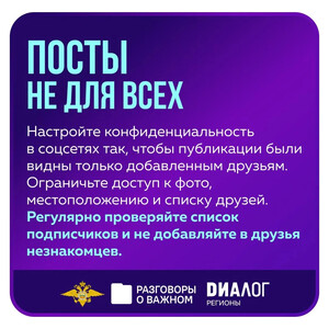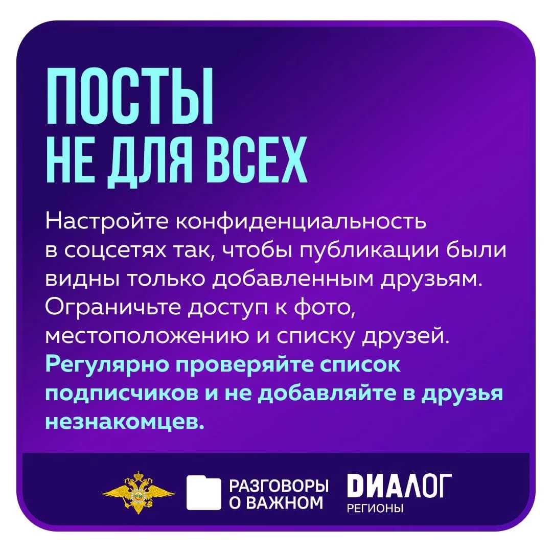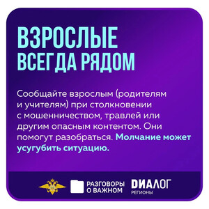 📍 В понедельник, 2 марта, во всех школах России состоялось занятие цикла «Разговоры о важном» (https://max.ru/razgovori_o_vajnom), посвященное правилами безопасного поведения в Интернете. Материалы к занятию были разработаны совместно с экспертами УБК МВД России (https://max.ru/cyberpolice), АНО «Диалог Регионы» и психологами Московского государственного психолого-педагогического университета (https://max.ru/id7702181537_biz). 📚 Школьники с 1 по 11 класс и учащиеся СПО познакомились с важнейшими правилами безопасного поведения в Интернете. Что нужно помнить каждому, чтобы общение в Сети было безопасным — рассказали в карточках. ✔️ Информацию обо всех новых схемах мошенников можно оперативно узнать, подписавшись на проект «Лапша Медиа» (https://max.ru/lapshamedia). | |